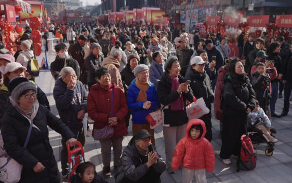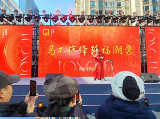上午11时,“马不停蹄·隆福潮集”隆福寺新春市集欢乐开演。中国杂技团的魔术、中国木偶艺术剧院的《小木偶之歌》、北京歌剧舞剧院的舞蹈《同堂盛世》与歌曲《欢天喜地》、北京曲艺团的相声《打灯谜》与鼓曲《长寿村》、北京民族乐团的二胡演奏《新赛马》、北京市河北梆子剧团的经典折子戏《借扇》《大登殿》《战宛城》……轮番登场,吸引超千名市民游客驻足。台上演员倾情演绎,台下观众掌声不断,喜庆氛围在欢声笑语中蔓延。